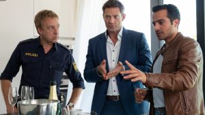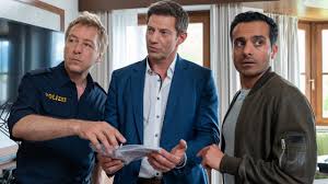 Baran Hêvî (Mitte) als Kommissar Kilian Kaya in “Die Rosenheim-Cops”. In “Alle neune und eine Leiche” ermittelt er mit seinem Kollegen Sven Hansen (Igor Jeftić, links) und Polizeihauptmeister Michael Mohr (Max Müller).