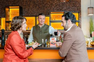 Die Rosenheim-Cops – Eine elegante Ausrede – Früh am Morgen liegt Dirk Eckert tot im Park – erschlagen beim Joggen. Zwei Wochen zuvor war seine Finanzfirma bankrottgegangen. Bei ihren Ermittlungen stoßen die Cops auf ein Netz aus familiären Spannungen, geplatzten Träumen und krummen Geschäften. Jeder aus Eckerts Umfeld scheint ein Motiv zu haben. Während die Untersuchung voranschreitet, ringt Kommissar Anton Stadler mit einem ganz anderen Problem: Um einem veganen Grillabend zu entkommen, greift er zu fadenscheinigen Ausreden. – Im Bild: Beim Abendessen im “Times Square” erfährt Kommissarin Andresen (Sophie Melbinger, l.) im Beisein von Jo (Christian K. Schaeffer, M.), weshalb Controller Donato (Paul Brusa, r.) seine Teilnahme am Fachvortrag abgesagt hat. Foto: ORF/ZDF/Linda Gschwentner. Veröffentlichung honorarfrei nur für redaktionelle Berichterstattung in Sendungszusammenhang und mit Copyrightangabe. Kontakt: foto@orf.at