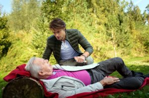Als Werner (Dirk Galuba, v.) vor seinen Augen zusammenbricht, muss Joshua (Julian Schneider, h.) sich entscheiden: Rettet er Werner oder sich selbst?
